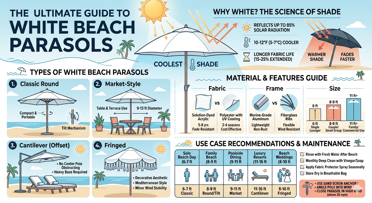 Putih bukan sekadar pilihan gaya — ia adalah warna yang paling cekap dari segi haba untuk payung pantai kerana permukaan berwarna terang mencerminkan dan bukannya menyerap tenaga suria.